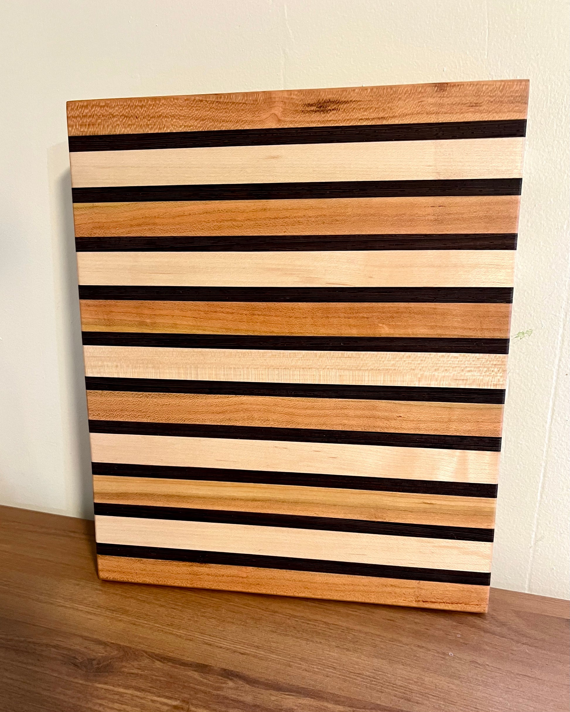 Handcrafted with maple, walnut & cherry, this 12x 18 horizontal striped cutting board is one of a kind.